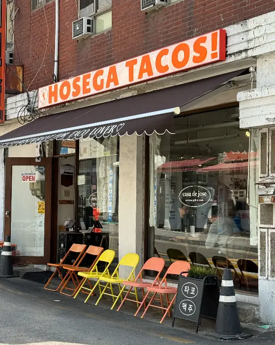 주황색 간판에 ‘HOSEGA TACOS!’라고 크게 쓰여 있는데, 이게 또 그렇게 힙해 보일 수가 없어요. 문 옆에 세워진 알록달록한 접이식 의자들은 마치 멕시코 길거리 음식점을 연상시키면서도, 그 자체로 인테리어의 한 부분처럼 센스가 넘치더라고요. “OPEN”이라고 쓰인 문을 열고 들어서는 순간, 뭔가 특별한 경험이 시작될 것 같은 예감이 들었죠.