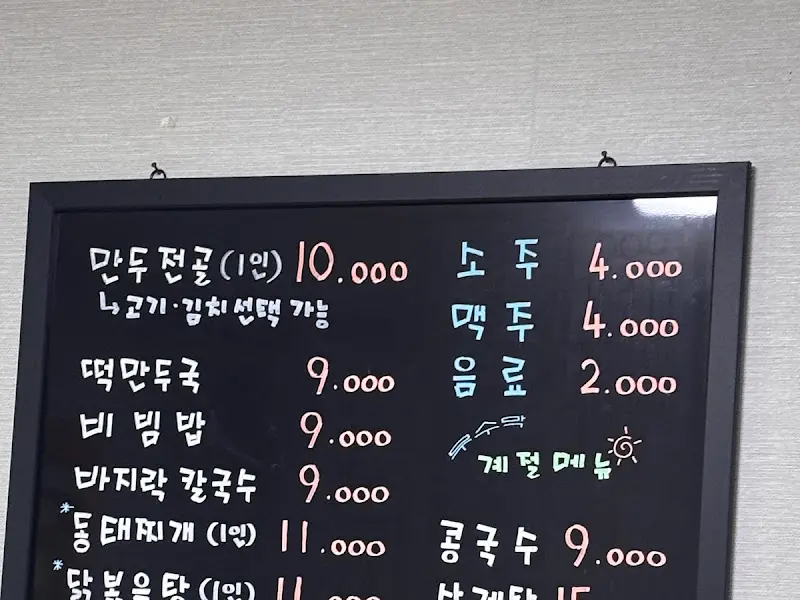 문을 열자마자 느껴지는 따스함. 마치 시골 할머니 댁에 놀러 온 듯 푸근한 분위기가 나를 반긴다. 테이블마다 옹기종기 모여 앉아 만두전골을 끓여 먹는 사람들의 모습에서 이미 맛집 바이브가 느껴진다. 벽에 걸린 메뉴판을 스캔하니, 만두전골(1인) 10,000원, 떡만둣국 9,000원, 비빔밥 9,000원 등 가격도 착하다. 요즘 같은 고물가 시대에 이런 혜자스러운 가격이라니, 사장님 리스펙!