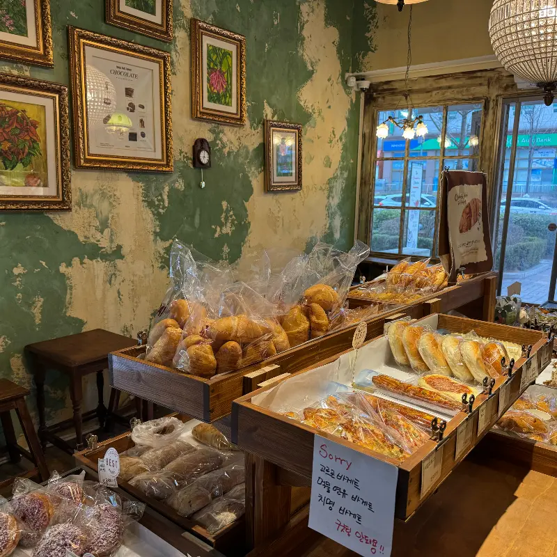 계산을 기다리는 동안, 빵집 내부를 둘러봤다. 아늑한 인테리어와 곳곳에 놓인 아기자기한 소품들이 눈길을 끌었다. 벽에는 액자들이 걸려 있었고, 테이블 위에는 귀여운 인형들이 놓여 있었다. 마치 동화 속에 들어온 듯한 느낌이었다. 직원분들도 모두 친절하셔서 기분 좋게 빵을 고를 수 있었다.