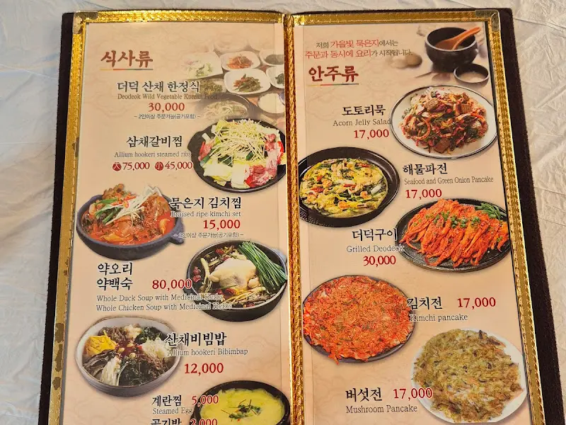 메뉴판을 펼쳐 들었다. 묵은지 김치찜, 산채비빔밥, 파전 등 하나하나 놓치기 아쉬운 메뉴들이 눈길을 사로잡았다. 고민 끝에 묵은지 김치찜과 파전을 주문했다. 특히 묵은지 김치찜은 이곳의 대표 메뉴로, 3년 묵은 묵은지의 깊은 맛을 제대로 느낄 수 있다고 하니 기대감이 컸다.