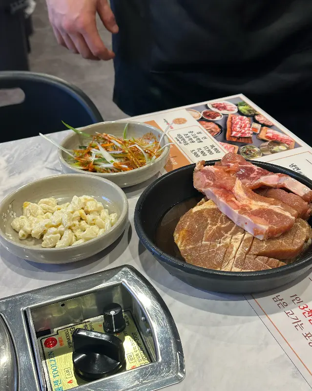 잘 정돈된 테이블에 놓인 서서갈비 무한리필 메뉴의 고기, 마카로니 샐러드, 양파절임