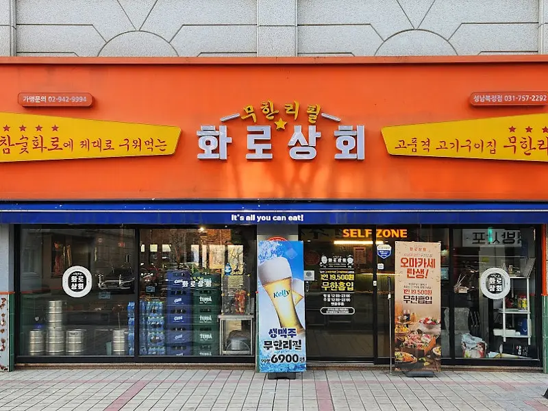 드디어 벼르고 벼르던 화로상회 가천대점에 방문했다! 가성비 끝판왕이라는 소문을 익히 들어 알고 있었지만, 직접 경험해보니 그 기대치를 훨씬 뛰어넘는 곳이었다. 문을 열고 들어서는 순간, 왁자지껄한 활기와 맛있는 고기 냄새가 코를 찔렀다. 넓고 깔끔한 내부, 테이블마다 놓인 환풍구, 그리고 쉴 새 없이 돌아가는 직원들의 모습에서 맛집의 기운이 느껴졌다. 특히 한쪽 벽면을 가득 채운 셀프바는 보기만 해도 가슴이 웅장해지는 비주얼이었다. 자, 이제 본격적인 먹방을 시작해볼까?