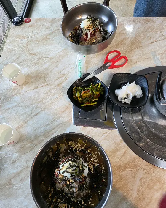 여기서 끝이 아니에요! 닭갈비와 환상의 궁합을 자랑하는 막국수가 등장했답니다. 커다란 대야에 담겨 나온 물막국수는 보기만 해도 시원함이 느껴졌어요. 뽀얀 메밀면 위에 김가루, 깨소금, 그리고 아삭한 채소들이 보기 좋게 올라가 있었죠.
