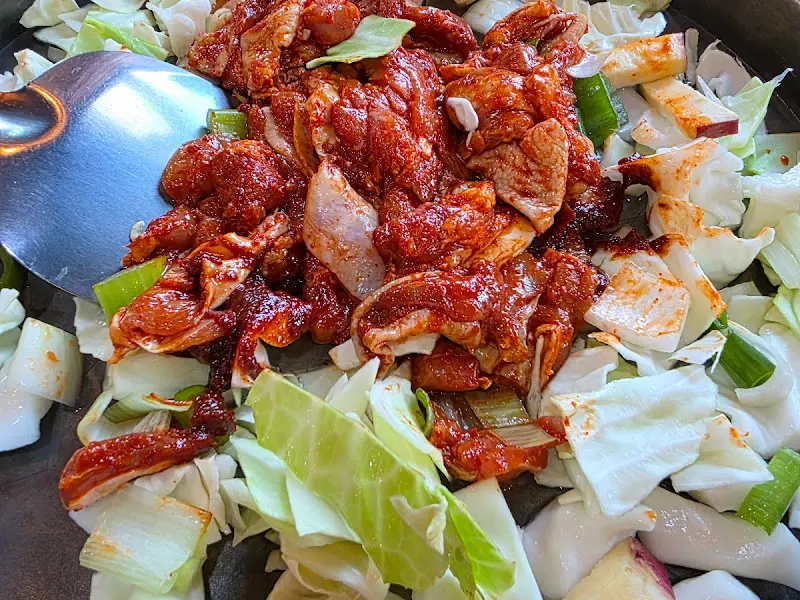 드디어 모습을 드러낸 닭갈비. 큼지막한 철판 위에 붉은 양념에 버무려진 닭고기와 양배추, 떡, 고구마가 푸짐하게 담겨 있었다. 직원분께서 능숙한 솜씨로 닭갈비를 볶아주셨다. 지글거리는 소리와 함께 매콤한 향이 코를 자극했고, 침샘은 쉴 새 없이 요동쳤다.
