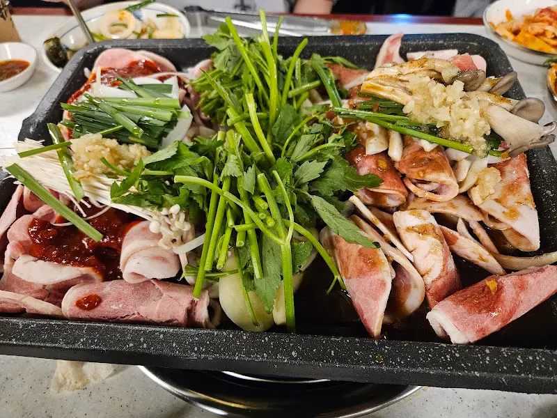 ‘미나리밭 오리사냥’의 메뉴는 크게 오리 로스와 주물럭으로 나뉩니다. 처음 방문이라면 반반 메뉴를 추천합니다. 저도 친구들과 반반으로 주문해서 두 가지 맛을 모두 즐겨봤는데요. 먼저 오리 로스는 담백하면서도 고소한 맛이 일품입니다. 신선한 오리고기의 육질이 그대로 느껴지고, 잡내 없이 깔끔한 맛이 인상적이었어요. 특히 함께 나오는 미나리와 곁들여 먹으니 향긋함이 더해져 입안이 더욱 풍성해지는 느낌이었습니다.