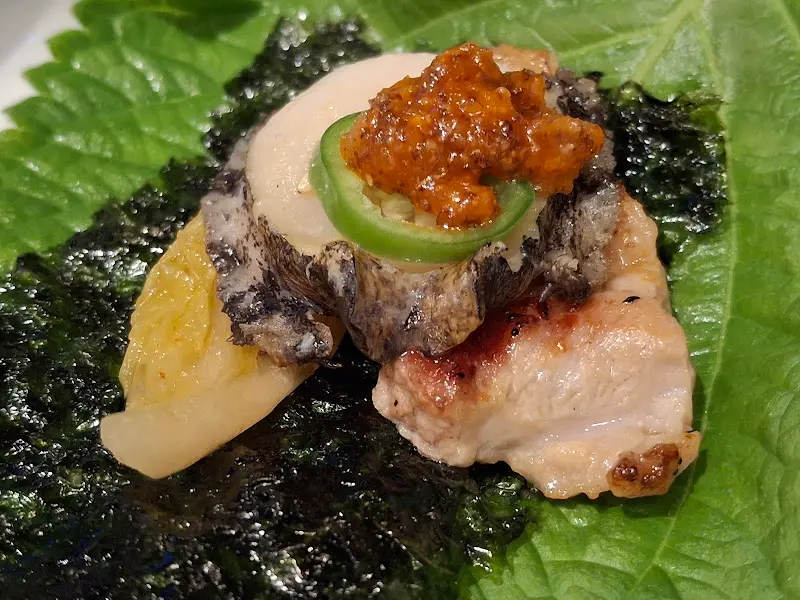 이번에는 삼겹살 차례! 노릇하게 구워진 삼겹살을 깻잎 위에 올리고, 묵은지와 구운 전복을 함께 올려 삼합으로 즐겨봤다. 와… 이거 진짜 미쳤다! 돼지고기의 고소함과 전복의 쫄깃함, 그리고 묵은지의 시원함이 환상적인 조화를 이루는 맛이었다. 깻잎의 향긋함까지 더해지니, 젓가락을 멈출 수가 없었다.