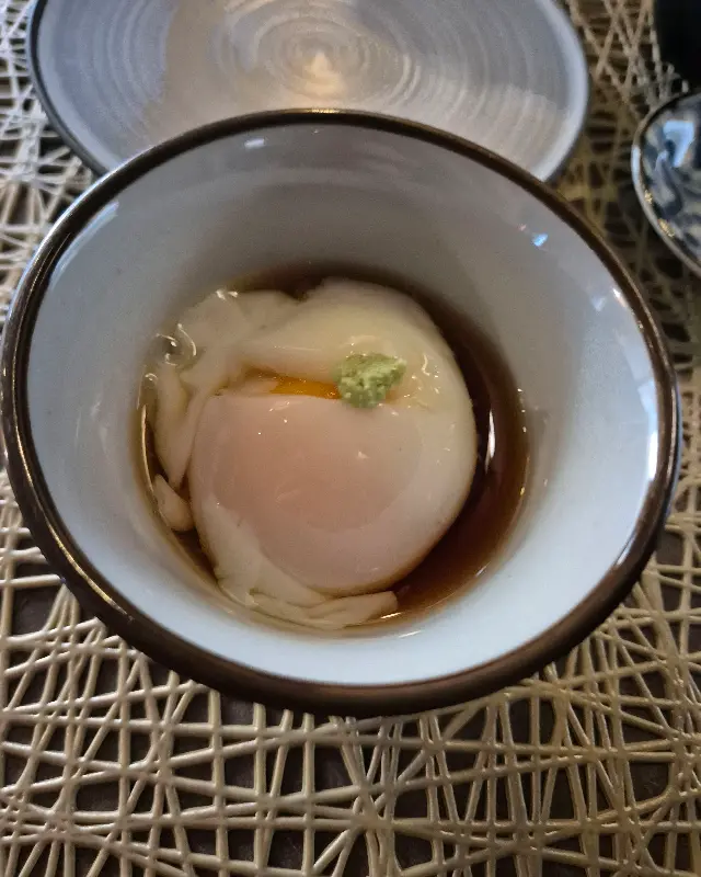 숙성회를 음미하고 있을 때, 앙증맞은 에피타이저가 나왔어. 수란 위에 와사비를 살짝 올린 건데, 톡 터지는 노른자와 와사비의 조화가 정말 훌륭하더라. 입안을 깔끔하게 정리해주는 느낌이었어. 메인 메뉴를 먹기 전에 입맛을 돋우기에 딱 좋았지.