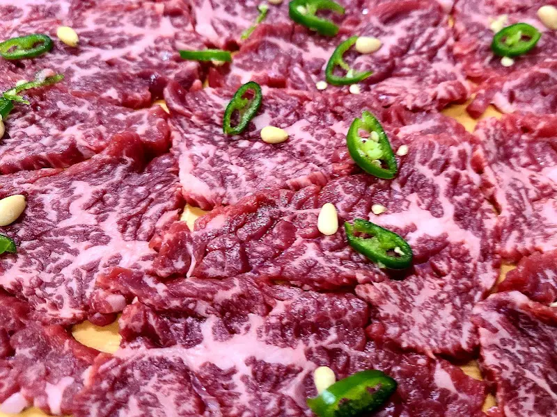 자리에 앉자마자 차돌박이를 시켰어. 메뉴판에 적힌 ‘횡성한우’라는 이름 석 자가 어찌나 믿음직스럽던지. 숯불이 들어오고, 드디어 기다리고 기다리던 차돌박이가 눈앞에 나타났는데, 이야… 그 마블링 좀 봐! 얇게 썰린 고기 위에 쫑쫑 썰린 청양고추와 잣이 듬뿍 뿌려져 있는 모습이 어찌나 먹음직스럽던지 몰라. 마치 꽃이 핀 것 같았어.