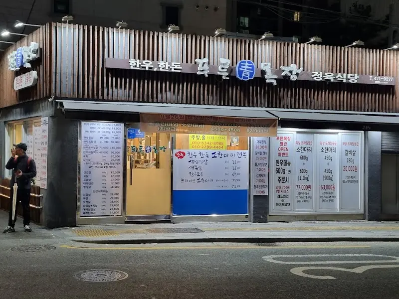 약속 시간보다 조금 일찍 도착해 주변을 둘러봤다. 강동역 근처는 활기 넘치는 분위기였다. 드문드문 보이는 오래된 건물들이 정겨움을 더했다. 드디어 ‘푸른목장’ 간판이 눈에 들어왔다. 한눈에 봐도 세월의 흔적이 느껴지는 외관이었지만, 왠지 모르게 편안함이 느껴졌다. 커다란 글씨로 적힌 메뉴판이 시선을 사로잡았다. ‘소 한마리’, ‘한우 등심’ 등 다양한 고기 메뉴들이 저렴한 가격에 판매되고 있었다. 기대감이 점점 커져갔다.