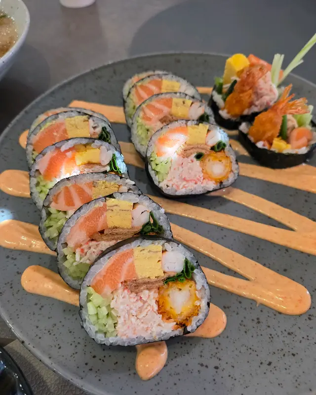 잠시 후, 기다리고 기다리던 후토마끼가 등장했다. 사진으로만 보던 큼지막한 비주얼에 감탄사가 절로 나왔다. 윤기가 흐르는 김 위에 밥, 신선한 회, 새우튀김, 계란, 채소 등 다양한 재료들이 아낌없이 들어간 모습은 그야말로 예술이었다. 젓가락으로 조심스럽게 집어 한 입 크게 베어 물었다. 입안 가득 퍼지는 다채로운 식감과 풍성한 맛의 향연! 신선한 재료들의 조화는 완벽했으며, 특히 톡톡 터지는 날치알과 바삭한 새우튀김의 조화는 잊을 수 없는 풍미를 선사했다. 곁들여진 소스의 은은한 단맛은 재료 본연의 맛을 더욱 돋보이게 했다.