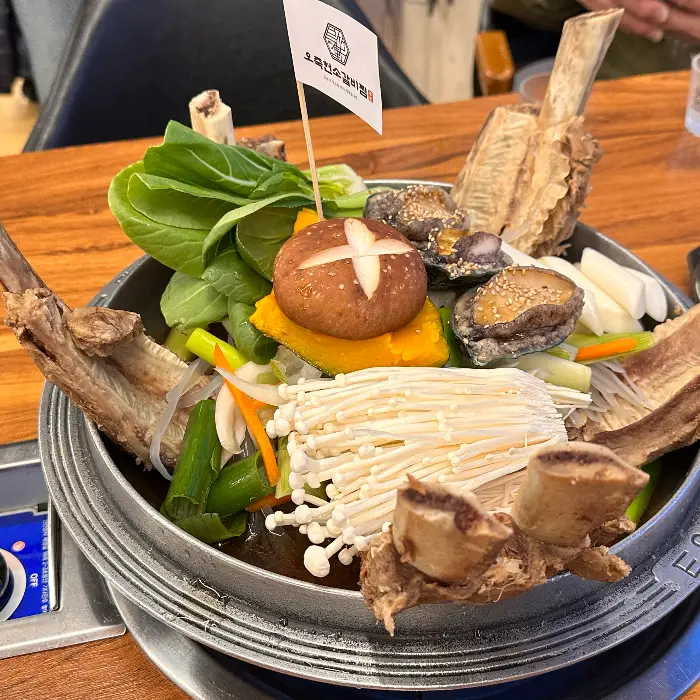 본격적인 식사의 시작은 단연 ‘대왕 소갈비찜’이었습니다. 짙은 갈색 양념에 윤기가 자르르 흐르는 갈비찜이 큼직한 냄비 가득 담겨 나왔습니다. 눈으로만 보아도 그 푸짐함에 압도될 정도였습니다. 뼈째 들려 나오는 왕갈비는 그 크기부터 남달랐고, 그 주위로는 큼직한 전복, 신선한 채소, 그리고 쫄깃한 당면이 어우러져 시각적인 풍요로움을 더했습니다.