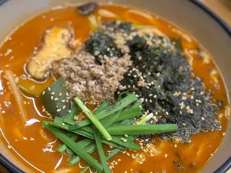드디어 기다리고 기다리던 장칼국수가 등장했다. 뚝배기에 담겨 나온 칼국수는 보기만 해도 얼큰해 보이는 비주얼이었다. 김 가루와 깨소금이 듬뿍 뿌려져 있고, 고기 고명과 채소가 어우러져 먹음직스러운 자태를 뽐냈다. 국물부터 한 입 맛보니, 캬~ 이 맛이지! 48시간 숙성된 육수라 그런지, 깊고 진한 맛이 정말 일품이었다. 너무 맵지도 않고, 적당히 칼칼하면서 시원한 국물이 속을 확 풀어주는 느낌! 어제 술을 좀 마셨는데, 해장에도 딱 좋을 것 같았다.
