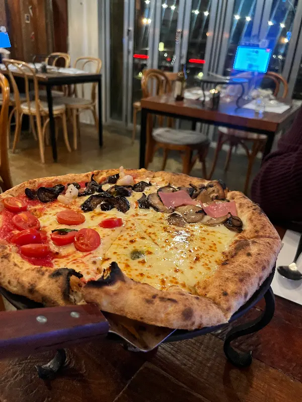 드디어 기다리고 기다리던 마르게리따 피자가 나왔어! 비주얼부터가 장난 아니더라. 화덕에서 갓 구워져 나온 쫄깃한 도우에 신선한 토마토소스, 그리고 듬뿍 올라간 모짜렐라 치즈까지! 진짜 침샘 폭발하는 비주얼이었어.