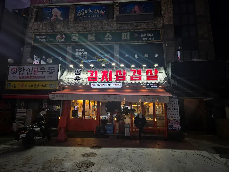 어휴, 진짜 오랜만에 마음 맞는 친구랑 제대로 된 삼겹살 먹고 왔어! 강서구청 메인 거리에 있는 “상수김치삼겹살”인데, 여기 진짜 찐이다. 퇴근하자마자 달려갔는데, 멀리서부터 간판 불빛이 아주 그냥 나를 부르더라고? 겉에서 보기에도 딱 느껴지는 맛집 포스! 얼른 들어가 봤지.