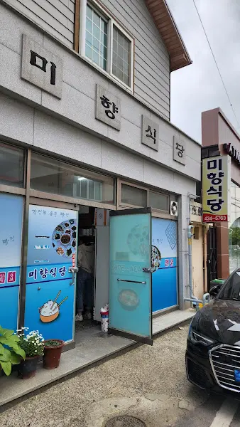 파란색 문이 인상적인 식당 외관은 세월의 흔적을 고스란히 담고 있었다. 간판에는 ‘미향식당’이라는 정갈한 글씨가 쓰여 있었고, 그 옆에는 ‘미향’이라는 두 글자가 큼지막하게 새겨진 또 다른 간판이 자리하고 있었다. 오래된 듯한 건물이었지만, 어딘가 모르게 정겹고 푸근한 느낌이 들었다. 마치 오랜만에 고향집에 방문한 듯한 기분이었다.
