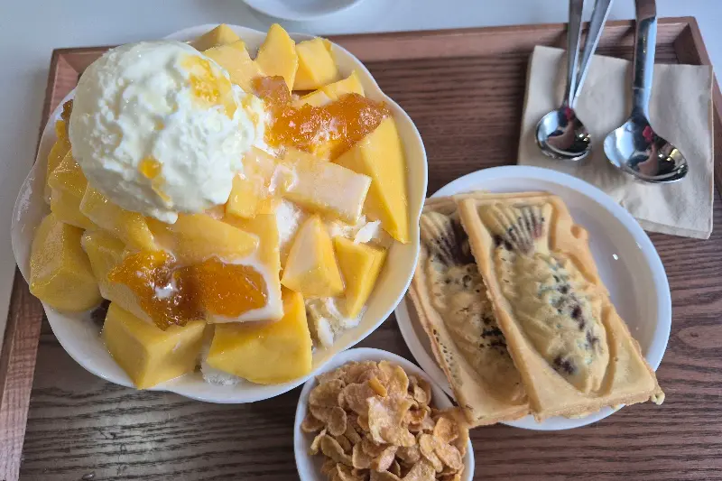 친구의 망고 빙수도 한 입 뺏어 먹어봤는데, 이것도 대박이었다. 냉동 망고가 아니라 생망고를 사용해서 그런지, 망고 특유의 향긋함과 달콤함이 입안 가득 퍼지는 느낌! 망고 과육도 진짜 아낌없이 넣어주셔서, 먹는 내내 행복했다.🥭 다음에는 꼭 망고 빙수 먹으러 다시 와야지 다짐했다.