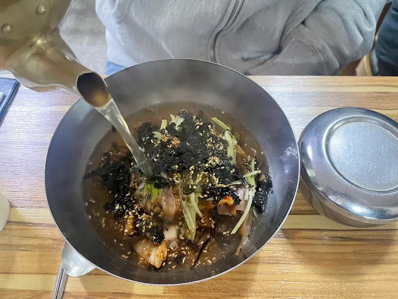 드디어 묵밥을 맛볼 시간! 놋 주전자에 담긴 따뜻한 육수를 묵밥에 조심스럽게 부었습니다. 맑은 육수가 묵과 채소 사이로 스며드는 모습이 마치 한 폭의 수채화 같았어요. 젓가락으로 휘휘 저어 한 입 맛보니… 와! 정말 놀라운 맛이었습니다. 묵은 흐물거리지 않고 적당히 탄력 있었고, 육수는 짜지 않으면서도 깊은 맛이 느껴졌습니다. 김 가루의 고소함과 깨의 향긋함이 어우러져 묵밥의 풍미를 한층 더 끌어올렸죠. 이건 정말, 먹어봐야 알 수 있는 맛입니다! 묵밥을 한 그릇 뚝딱 비우니 속까지 따뜻해지는 기분이었습니다.