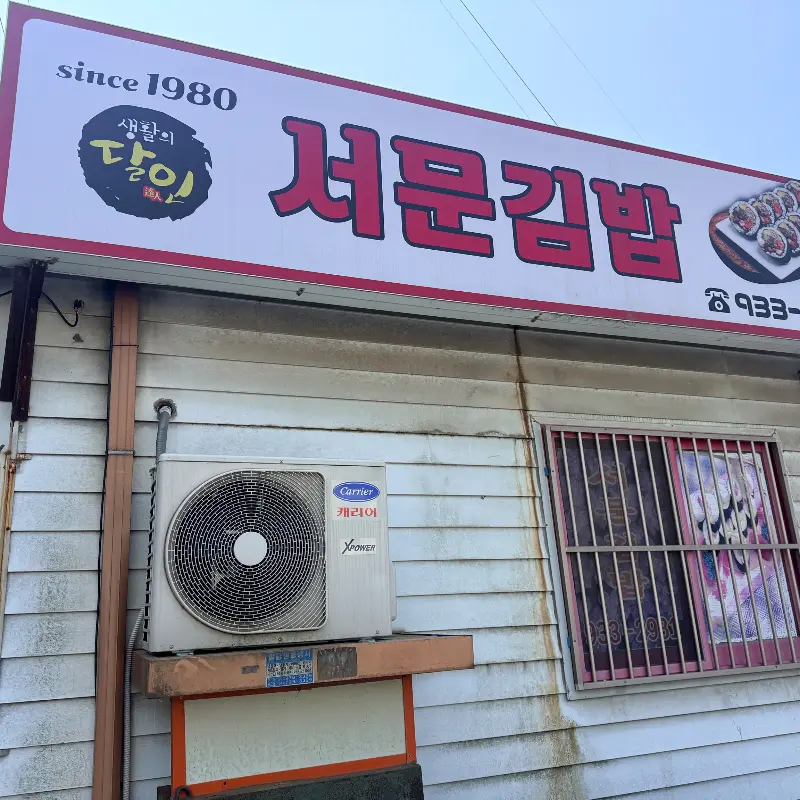 강화중앙시장 근처, 좁은 골목길 누비며 드디어 발견. 간판부터 레트로 갬성 뿜뿜! since 1980, 역사가 느껴지는 외관. 흰색 페인트칠 벗겨진 벽, 세월의 흔적이 고스란히. 에어컨 실외기도 낡았지만, 왠지 정겹다. 여기가 바로 그 유명한 김밥 성지인가.