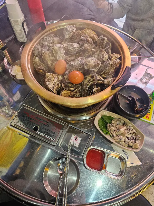잠시 후, 기다리던 굴찜이 테이블 위에 모습을 드러냈다. 큼지막한 냄비 안에 가득 담긴 석화의 모습은 그야말로 장관이었다. 굴 껍데기 사이로 살짝 보이는 뽀얀 속살은 신선함을 가득 머금고 있는 듯했다. 굴 특유의 비릿한 향은 전혀 느껴지지 않았고, 은은한 바다 내음만이 코끝을 간지럽혔다.