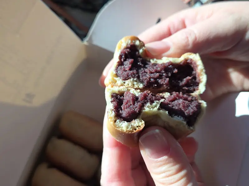 갓 구운 황남빵: 갓 구워져 나온 황남빵은 따뜻함이 그대로 느껴집니다. 빵 껍질은 얇고 부드러우며, 입안에 넣는 순간 사르르 녹아내리는 듯한 식감이 일품입니다. 팥소는 과하게 달지 않고 은은한 단맛이 감돌아 어르신들도 부담 없이 즐기실 수 있을 것 같습니다. 특히, 팥의 깊은 풍미가 그대로 느껴져, 왜 이곳이 황남빵의 원조인지 알 수 있었습니다. 사진에서 보이는 것처럼 팥앙금이 정말 가득 차 있어서, 한 입 베어 물 때마다 입안 가득 퍼지는 팥의 풍미가 행복감을 선사합니다. 이건 정말, 꼭 맛봐야 해요!