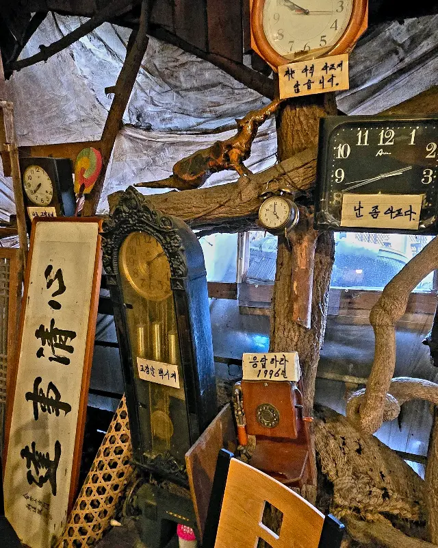 가게 내부는 마치 박물관을 연상케 했다. 에서 볼 수 있듯이, 여러 개의 시계가 벽에 걸려 있었는데, 제각기 다른 시간을 가리키고 있었다. 멈춰진 시계들에서 흘러간 시간의 흔적을 엿볼 수 있었다. 이 공간은 단순한 식당이 아닌, 추억과 이야기가 담긴 장소임을 짐작하게 했다.