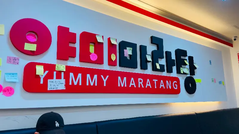 어미마라탕 입구 딱 들어서자마자 느껴지는 이 vibe! 깔끔한 인테리어에 넓은 공간, 완전 내 스타일이야. 테이블 간 간격도 넉넉해서 편안하게 식사할 수 있는 분위기. 벽에 붙은 “YUMMY MARATANG” 네온사인하며, 곳곳에 붙은 힙한 포스터들이 시선을 강탈해. 완전 인스타 감성 뿜뿜!