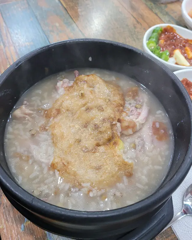 드디어 기다리고 기다리던 누룽지 삼계탕이 나왔다. 뚝배기 안에서 보글보글 끓고 있는 모습은 시각적으로도 식욕을 자극했다. 표면에는 황금빛 누룽지가 덮여 있었는데, 그 향긋한 냄새가 코를 간지럽혔다. 누룽지는 쌀 전분 입자가 고온에서 장시간 가열되면서 덱스트린으로 분해되어 단맛과 고소한 향을 내는 마이야르 반응의 산물이다.
