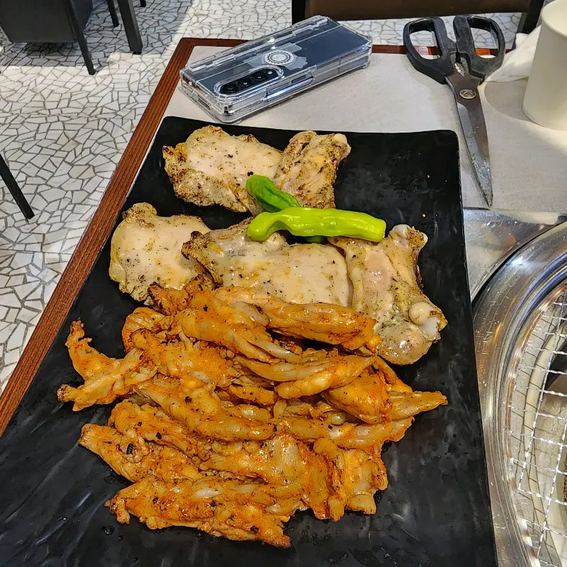 제일 먼저 소금 닭갈비부터 먹어봤는데, 와… 진짜 입에서 살살 녹는다는 게 뭔지 알겠더라. 닭고기 자체가 엄청 부드럽고 촉촉한데, 숯불 향이 은은하게 배어 있어서 진짜 환상적인 맛이었어. 소금 간이 딱 맞아서, 닭고기 본연의 맛을 제대로 느낄 수 있었지.