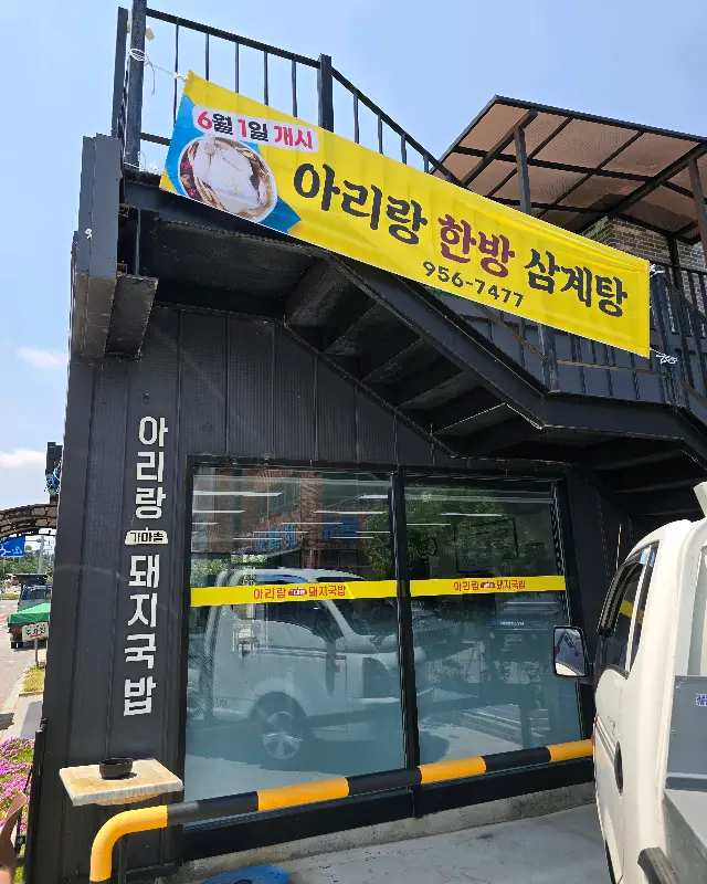 가게 앞에 딱 도착하니, 큼지막한 간판에 “아리랑 가마솥 돼지국밥”이라고 떡하니 쓰여 있는 게, 왠지 모르게 정겹고 푸근한 느낌이 들었어. 건물 외관은 깔끔하고 현대식이었지만, 그 안에 담긴 세월의 흔적과 맛에 대한 자부심이 느껴졌다고 할까? 커다란 유리창에 붙은 노란색 스티커에도 상호가 적혀있어 한눈에 찾을 수 있었지.