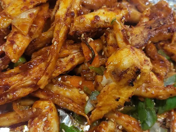 가장 먼저 제 실험 대상이 된 것은 이곳의 대표 메뉴인 ‘더덕정식’이었습니다. 겉보기에도 먹음직스러운 붉은 양념 옷을 입은 더덕은 짙은 갈색 빛을 띠며, 마치 실험실에서 정밀하게 제어된 온도에서 조리된 듯 완벽한 마이야르 반응의 결과물을 보여주고 있었습니다. 160도 이상의 고온에서 단백질과 환원당이 만나 복잡한 화학 반응을 일으키며 형성되는 갈색 크러스트는 보기에도 훌륭했지만, 그 풍미는 훨씬 더 깊었습니다. 입안에 넣자마자 더덕 특유의 알싸하면서도 달콤한 향이 퍼져 나가는데, 이는 더덕에 함유된 사포닌 성분이 휘발성을 띠어 공기 중에 퍼지면서 후각을 자극하기 때문입니다. 씹을수록 느껴지는 쫄깃한 식감은 더덕의 섬유질 구조가 건강하게 살아있음을 증명하는 듯했습니다. 겉은 살짝 바삭하면서도 속은 촉촉한, 이 완벽한 텍스처의 조화는 오랜 시간 훈련된 조리사의 섬세한 기술을 방증하는 것이죠.