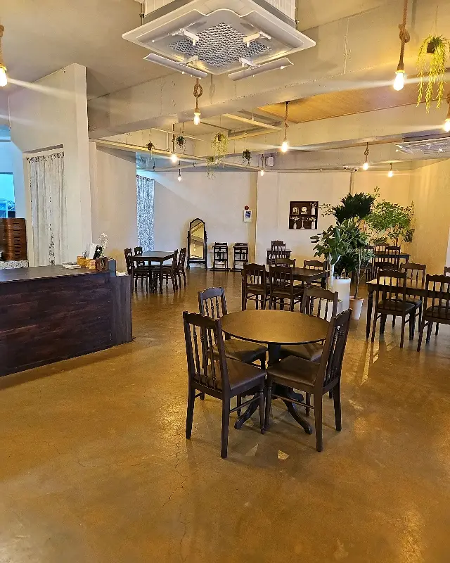 * : 넓고 테이블 간 간격이 넉넉한 카페 내부. 편안하게 대화를 나눌 수 있는 공간이다.