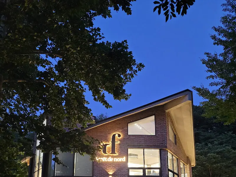 굽이굽이 이어진 길을 따라, 드디어 상하목장이 눈 앞에 나타났다. 멀리서도 눈에 띄는 독특한 외관은 주변 풍경과 조화롭게 어우러져 있었다. 벽돌로 지어진 듯한 건물은 세련되면서도 자연스러운 멋을 풍겼고, 건물 전면에 새겨진 “df veret de nord”라는 문구는 왠지 모를 기대감을 불러일으켰다. 푸른 하늘을 배경으로 우뚝 솟은 건물의 모습은 그 자체로 하나의 예술 작품과 같았다.