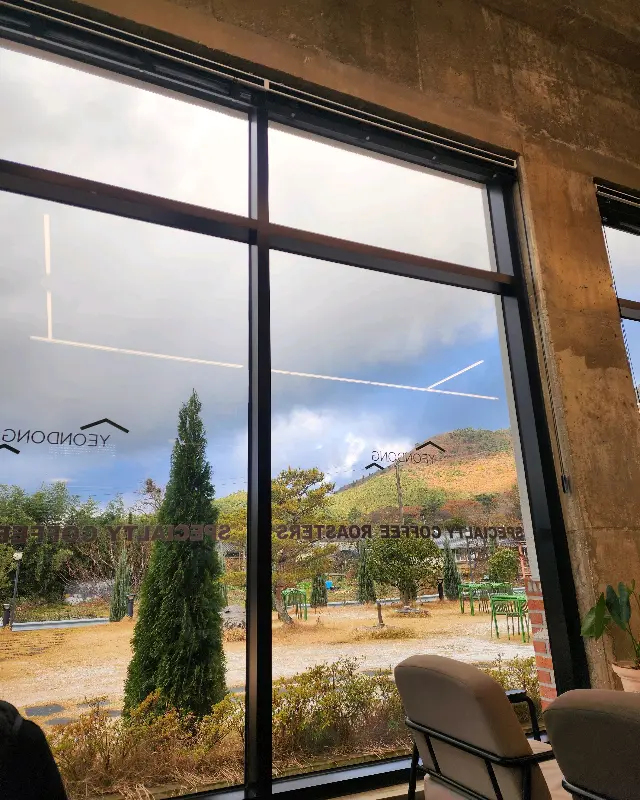 통창으로 보이는 카페 외부 풍경