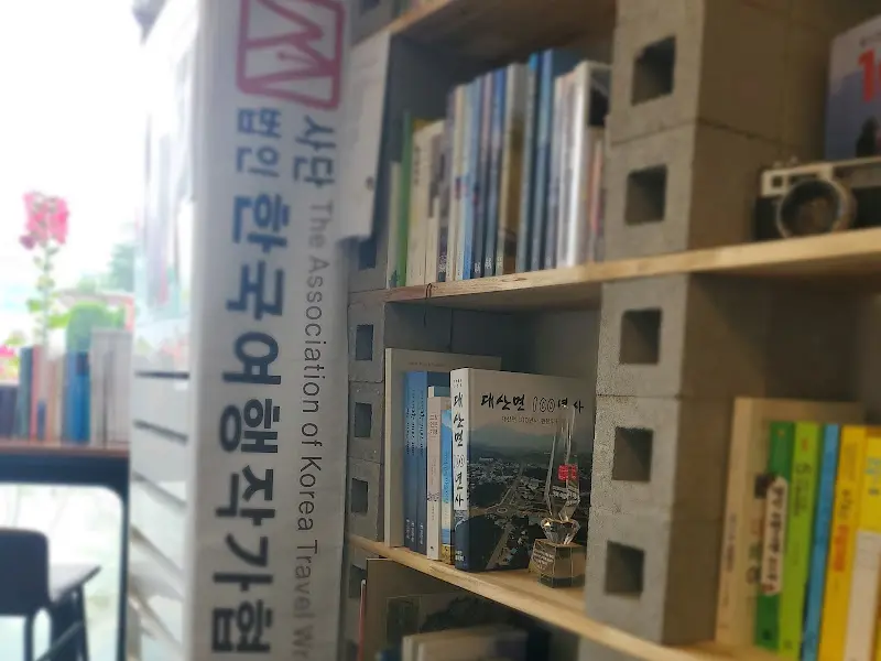 문을 열자마자 보이는 건 다름 아닌 책장! 그것도 여행 관련 책들이 빼곡하게 꽂혀 있는 책장이었다. 📚 순간 ‘어라, 내가 카페를 잘못 들어왔나?’ 싶었지만, 커피 향이 은은하게 풍기는 걸 보니 제대로 찾아온 게 맞았다. 고창 관련 책자들이 가장 먼저 눈에 띄는 걸 보니, 이 곳 보통 내공이 아니다 싶었다.
