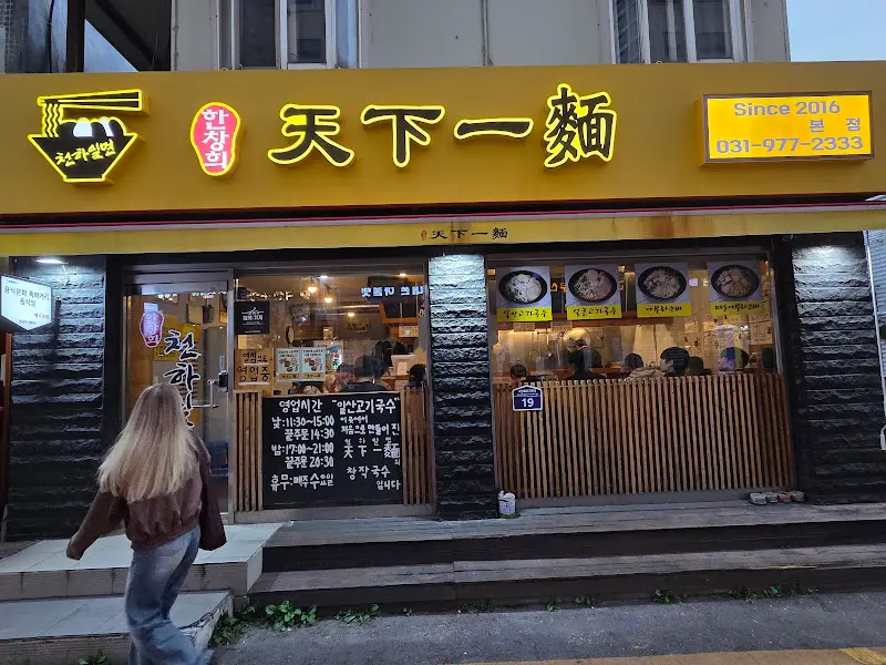 간만에 콧바람 쐬러 일산 나들이를 나섰지. 뭘 먹을까 고민하다가, 왠지 모르게 끌리는 국수집이 있더라고. 이름하여 ‘한창희 천하일면 일산역본점’. 간판부터가 예사롭지 않았어. 노란색 간판에 검은 글씨로 큼지막하게 쓰여진 가게 이름이 어찌나 눈에 띄던지. 게다가 간판 옆에 조그맣게 “Since 2016″이라고 적혀있는 걸 보니, 꽤 오랫동안 이 자리에서 사랑받아온 맛집인 것 같더라고.