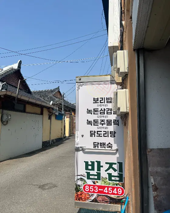 처음엔 사실 뭘 먹을까 주변을 두리번거렸어요. 떡갈비니 뭐니 하는 것들은 어딜 가나 비슷한 것 같고, 좀 특별한 맛을 찾고 싶었거든요. 그때 눈에 띈 건, 낡았지만 정갈한 간판이었어요. ‘보리밥’, ‘녹돈삼겹살’, ‘녹돈떡갈비’, ‘도토리묵’, ‘닭볶음탕’, ‘닭백숙’. 딱 봐도 옛날부터 하시던 맛집 느낌이 물씬 풍기더라고요. 망설임 없이 문을 열고 들어섰는데, 후덥지근한 날씨에 지친 몸이 저절로 풀리는 듯한 따뜻한 공기가 먼저 반겨주더군요.