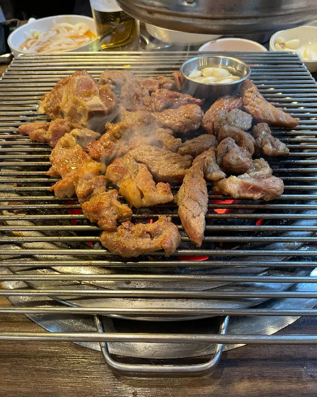 드디어 기다리고 기다리던 돼지갈비가 나왔어. 숯불이 들어오는데, 이야, 화력이 장난이 아니네. 숯불 위에 돼지갈비를 올리니, 치익- 하는 소리와 함께 맛있는 냄새가 코를 찔러. 직원분들이 직접 고기를 구워주시는데, 어찌나 능숙하신지. 굽는 타이밍, 뒤집는 순간, 불 조절까지, 완벽하게 해주시더라고. 덕분에 나는 편하게 앉아서 이야기 나누면서 기다릴 수 있었지.