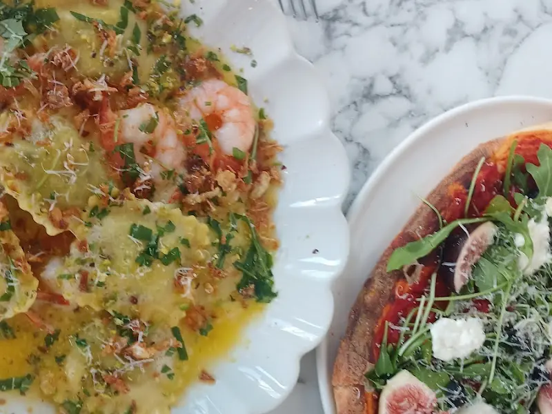 음식은 생각보다 빨리 나왔다. 가장 먼저 눈에 띈 것은 새우 라비올리였다. 접시 가득 담긴 라비올리 위에는 탐스러운 새우와 다진 허브, 그리고 빵가루 같은 고명이 뿌려져 있었다. 올리브 오일이 윤기를 더하며 식욕을 자극했다. 마치 예술 작품을 감상하는 듯한 기분이었다.