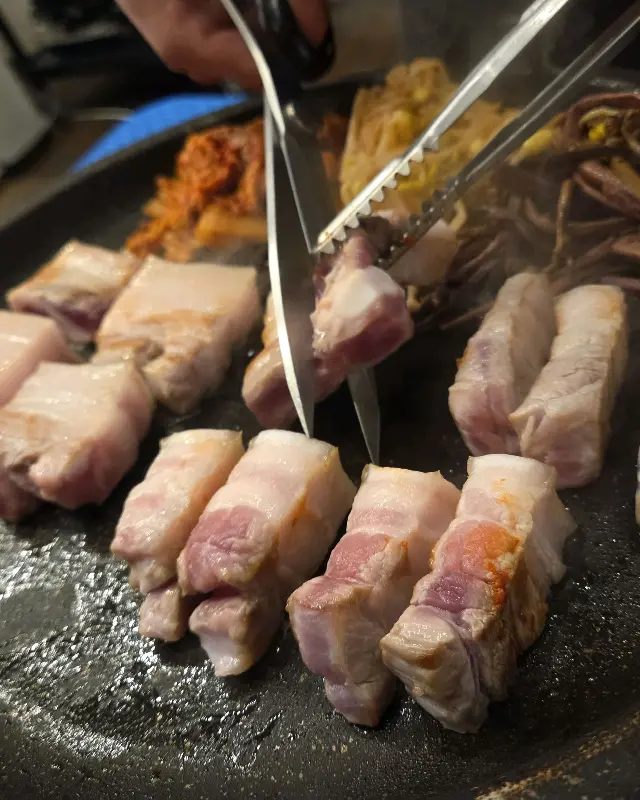 드디어 기다리고 기다리던 굵은 오겹살이 나왔는데, 이야, 정말 두툼하더라! 겉은 바삭하고 속은 촉촉하게 구워진 오겹살은, 보기만 해도 군침이 꼴깍 넘어갔어.