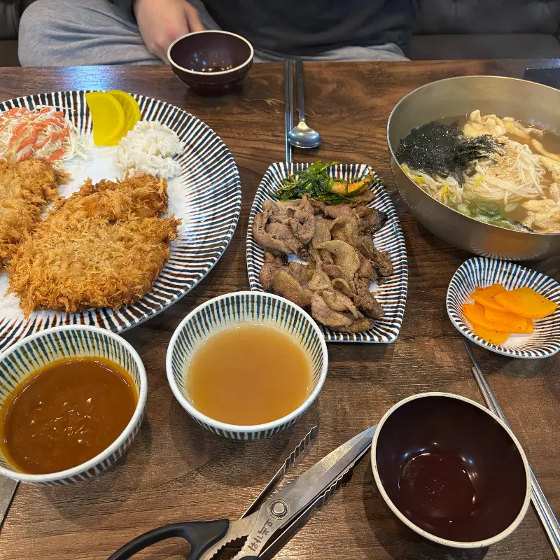 마지막으로 한 장 돈까스가 등장했다. 겉은 바삭하고 속은 촉촉한, 이상적인 돈까스의 표본이었다. 빵가루는 기름에 튀겨지면서 덱스트린으로 분해되어 달콤한 풍미를 더했고, 돼지고기는 적절한 온도에서 조리되어 육즙을 가득 머금고 있었다. 돈까스 소스는 새콤달콤하면서도 감칠맛이 풍부했는데, 아마도 다양한 과일과 채소를 오랜 시간 끓여 만든 듯했다. 을 보면 돈까스 위에 뿌려진 소스가 상당히 인상적이다. 마요네즈와 돈까스 소스의 조합은 시각적으로도 훌륭하며, 맛 또한 환상적이다. 아이들이 특히 좋아할 만한 메뉴라는 생각이 들었다.