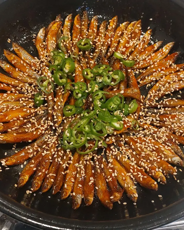 드디어 첫 번째 메뉴, 도리뱅뱅이 등장했다. 쟁반 위에 빙어가 뱅글뱅글 돌려 담겨 있는 모습은 그야말로 예술이었다. 표면에는 윤기가 자르르 흘렀고, 깨와 채 썬 고추가 뿌려져 있어 시각적인 만족감을 더했다. 160도에서 마이야르 반응이 활발하게 일어난 듯, 빙어 겉면은 먹음직스러운 갈색을 띠고 있었다. 한 마리 집어 입에 넣으니, 바삭한 식감과 함께 달콤하면서도 매콤한 양념 맛이 느껴졌다. 캡사이신이 TRPV1 수용체를 자극하여 통증과 쾌감을 동시에 유발하는, 전형적인 ‘매운맛 중독’을 일으키는 맛이었다. 빙어 특유의 고소함과 양념의 조화는 가히 환상적이었다. 마치 맥주를 부르는 맛이랄까.