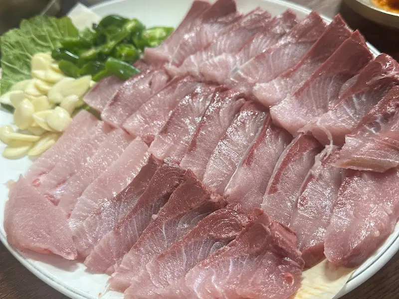 드디어 기다리고 기다리던 방어회 등장! 와… 비주얼부터 압도적이다. 큼지막하게 썰린 방어회는 마치 붉은 보석처럼 윤기가 좔좔 흐른다. 곁들여 나온 마늘, 깻잎, 고추의 색감 조화도 예술이네. 한 점 집어서 입에 넣는 순간, 진짜 감탄사가 절로 나왔다. 두툼한 식감은 말할 것도 없고, 입 안에서 사르르 녹아내리는 기름진 풍미가 진짜… 이거 완전 미쳤다! 신선한 방어의 향긋함이 코를 찌르고, 씹을수록 느껴지는 고소함은 혀를 황홀하게 만든다.