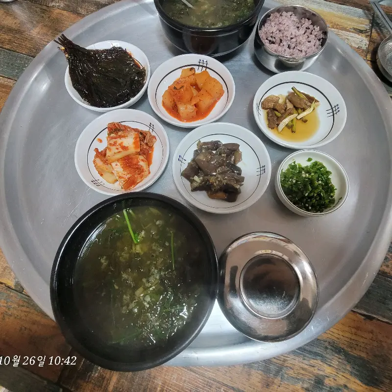 뽀얀 김이 모락모락 나는 올갱이국을 중심으로, 윤기가 자르르 흐르는 밥, 그리고 정갈하게 담긴 여러 가지 반찬들이 쟁반 위에 가득했어. 놋쟁반에 담겨 나오니 더 운치있고, 진짜 옛날 할머니 밥상 같은 느낌이더라.