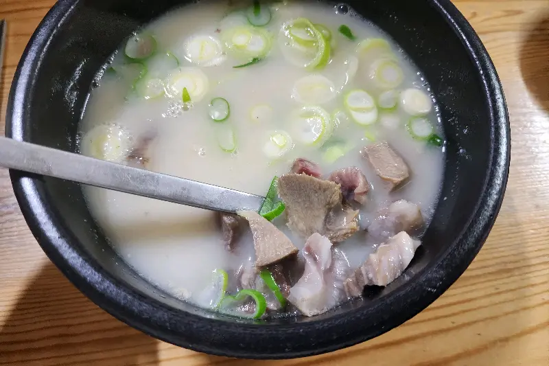 자리에 앉아 곰탕을 주문하자, 곧바로 김이 모락모락 나는 곰탕 한 그릇이 내 앞에 놓였다. 뽀얀 국물 위로 송송 썰린 파가 넉넉하게 올려져 있었고, 국물 안에는 도톰한 고기들이 푸짐하게 들어 있었다. 보기만 해도 군침이 절로 돌았다.