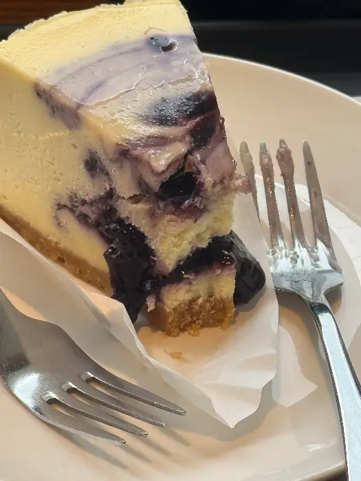 저는 늘 그랬듯, 이곳의 시그니처 메뉴 중 하나인 ‘블루베리 치즈케이크’를 주문했습니다. 사실, 이 케이크는 제게 추억이 깃든 메뉴이기도 합니다. 예전에는 동그란 형태였는데, 지금은 조각으로 판매되고 있더군요. 변함없이 부드러운 크림치즈의 풍미와 새콤달콤한 블루베리 소스의 조화는 여전히 제 입맛을 사로잡았습니다. 포크로 한 조각 떠 입안에 넣는 순간, 입안 가득 퍼지는 풍부한 맛과 부드러운 식감은 황홀 그 자체였습니다. 빵 부분은 바삭함과 촉촉함의 절묘한 균형을 이루고 있었고, 그 위에 얹어진 크림치즈는 마치 구름처럼 사르르 녹아내렸습니다. 블루베리 소스는 과하지 않게 상큼함을 더해주며 전체적인 맛의 균형을 잡아주었죠.