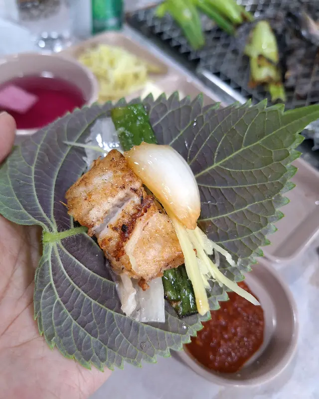 상추나 깻잎에 싸 먹어도 정말 맛있더라구요. 깻잎 특유의 향긋함이 장어의 느끼함을 잡아주고, 생강과 마늘의 알싸함이 더해져, 정말 최고의 조합이었어요. 사진처럼 깻잎에 장어 한 점 올리고, 생강, 마늘, 구운 대파까지 얹어서 쌈 싸 먹으면, 그야말로 입안에서 잔치가 벌어지는 맛이지요.