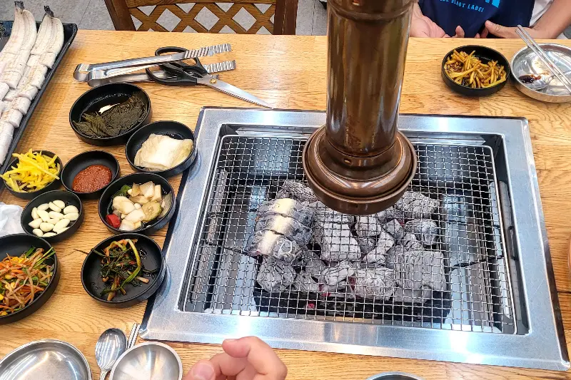 주문하고 기다리는 동안 샐러드바를 둘러봤는데, 야채 종류가 진짜 다양하더라. 깻잎, 상추는 기본이고, 대파, 양파까지 맘껏 구워 먹을 수 있게 준비되어 있었어. 쌈 채소 좋아하는 나로서는 완전 땡큐였지. 신선한 야채 듬뿍 가져다 놓고, 장어 기다릴 준비 완료!