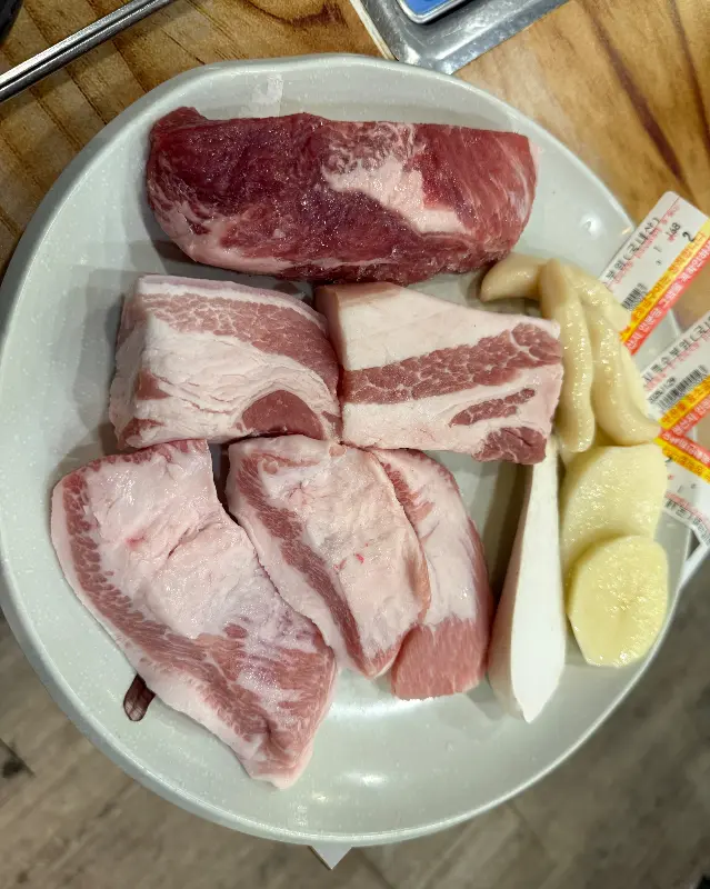 자리에 앉자마자 곧바로 삼겹살 3인분을 주문했다. 돼지고기 특유의 아미노산과 핵산이 풍부한 감칠맛은 코를 자극하며 기대감을 증폭시켰다. 잠시 후, 묵직한 웻 에이징(Wet Aging)을 거친 듯한 두툼한 삼겹살이 등장했다. 겉면에 선명하게 새겨진 칼집은 마치 과학자의 실험 노트를 연상시켰다. 이미 예열된 불판의 온도는 160도에 도달, 최적의 마이야르 반응을 위한 준비를 마친 상태였다.