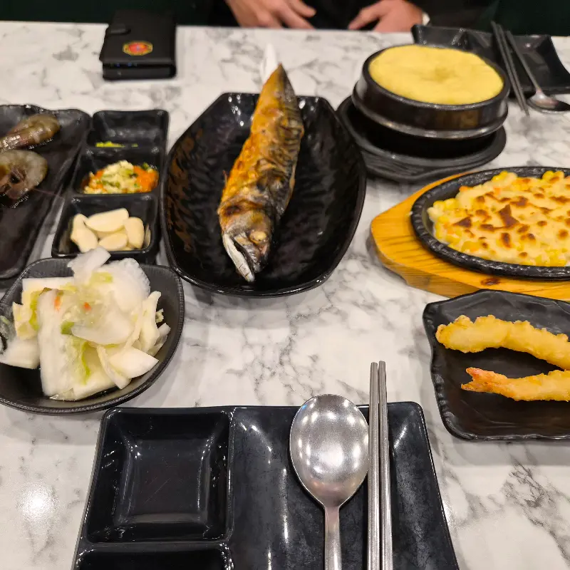 메뉴판을 스캔하는데, 웬걸? 가격도 생각보다 합리적인 편이다. 여러 가지 세트 메뉴들이 눈에 띄었지만, 오늘은 왠지 대방어에 꽂히는 날! 대방어 (소) 자에 뼈매운탕 추가요~! 주문하자마자 스끼다시가 쉴 새 없이 등장하는데, 진짜 눈 돌아가는 줄 알았다. 뜨끈한 계란찜, 바삭한 새우튀김, 달콤 짭짤한 간장새우, 고소한 콘치즈, 그리고 웬만한 생선구이 전문점 뺨치는 고등어구이까지! 특히 이 고등어구이, 겉은 바삭하고 속은 촉촉한 게 진짜 밥도둑이었다. 스끼다시 퀄리티가 이 정도라니… 메인 메뉴는 얼마나 더 쩐다는 거야?!