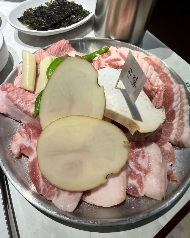 드디어 기다리고 기다리던 고기 등장! 선홍빛 비주얼에 감탄사가 절로 나왔어. 두툼하게 썰린 목살과 삼겹살, 그리고 큼지막한 새송이버섯과 꽈리고추까지. 사진으로 봤던 것보다 훨씬 퀄리티가 좋았어. 이건 맛이 없을 수가 없지.